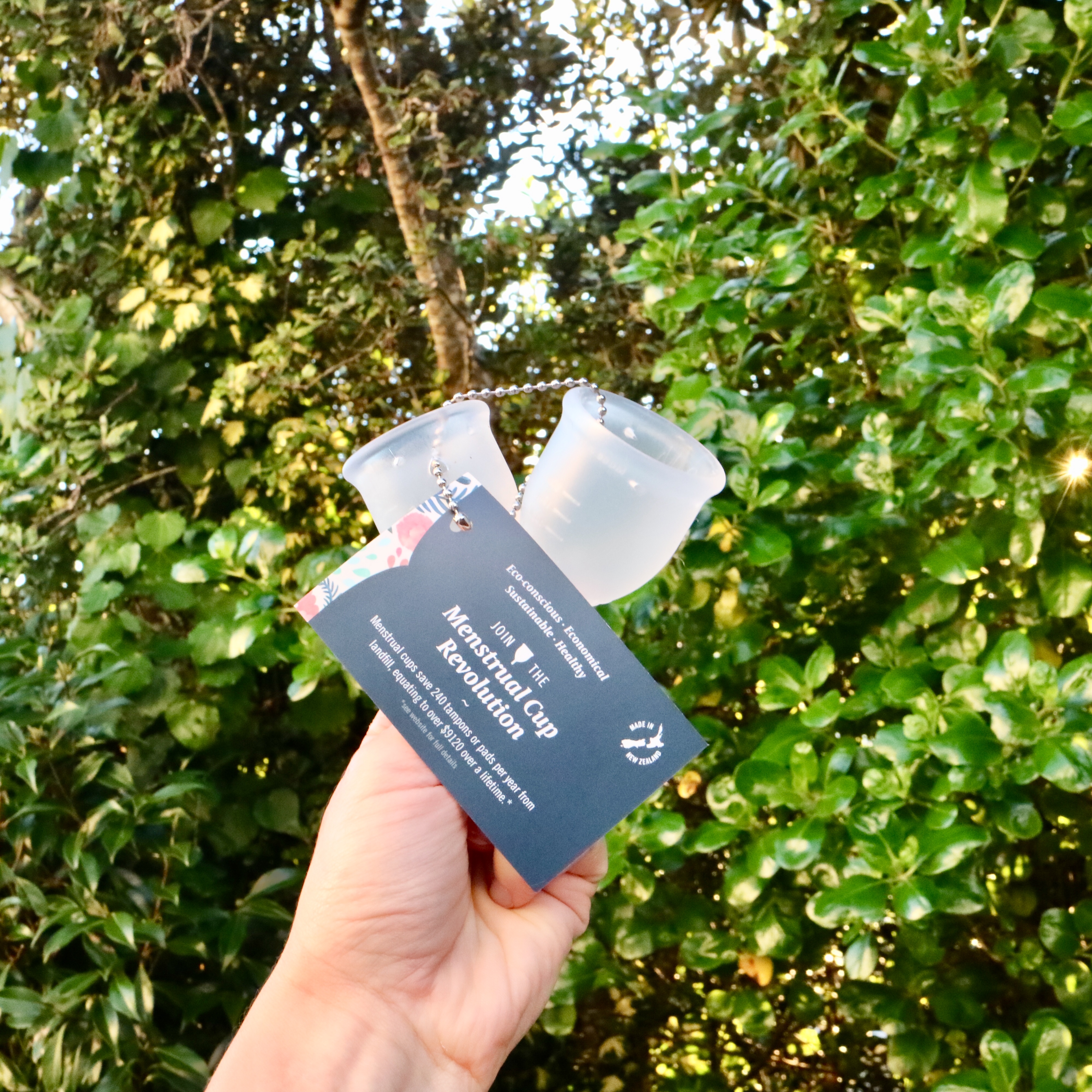 My Cup Size One and Two Two My Cup menstrual cups are being held up in front of bright green foliage.