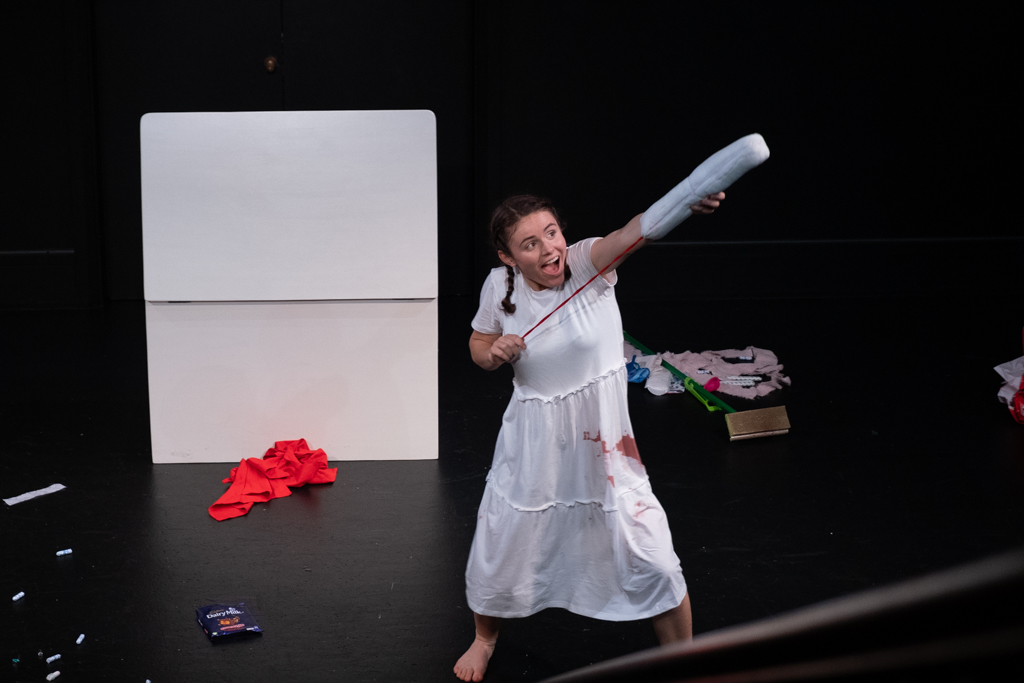 Amy Atkins greets everyone at the door of the Random Stage at BATS and hands them a menstrual cup. We are asked to return these at the end of the show (damn!). Once we’re in our seats, the sweet childhood exploration of menstruation begins!