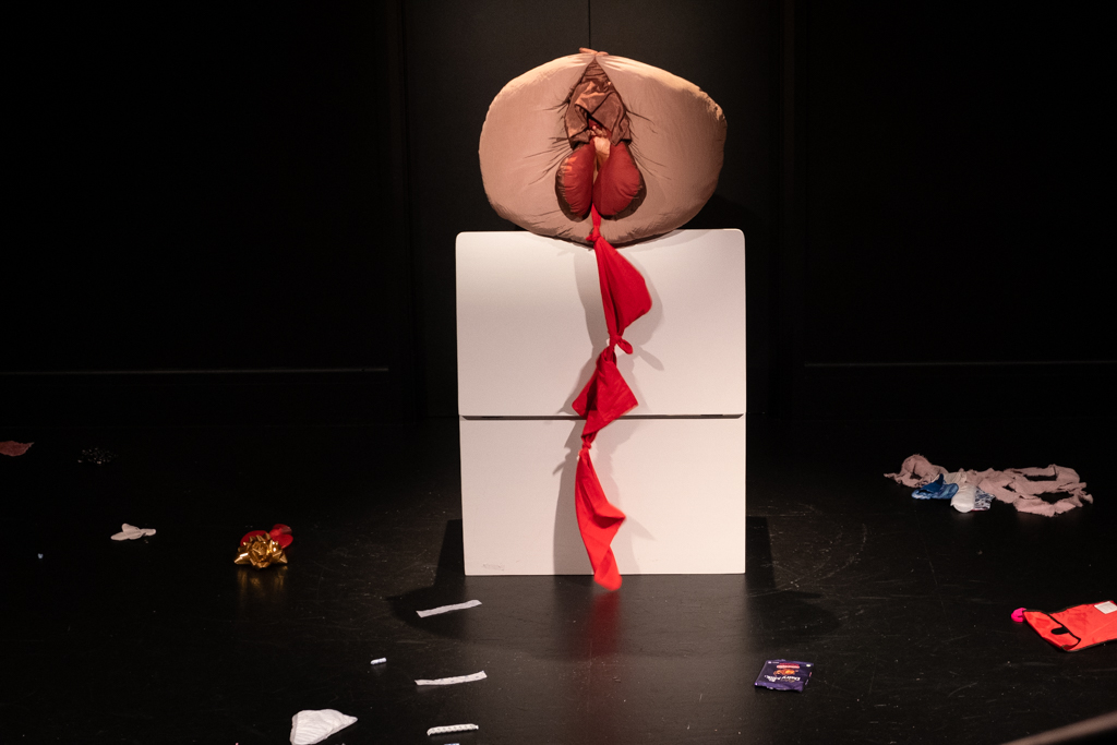 It’s Karla’s birthday and she a has a surprise present: her period. She also has a huge wrapped present that temptingly sits centre stage. The authoritative “Mum” voice over eventually allows the eager Klara to open her present. “The Hall of the Mountain King” plays as Klara gleefully tears the red wrapping paper and discovers a huge box full of feminine hygiene paraphernalia. Klara excitedly showers the black box theatre in tampons, pad, cups, and undies. She investigates her new toys with hilarious enthusiasm. Tampons are mistaken for lollipops and pads are used as futuristic armour. I loved seeing these items used in such an absurd but positive way. It felt like a big “fuck you” to the high schools boys that would hysterically throw unused tampons across the room as if they were bombs.